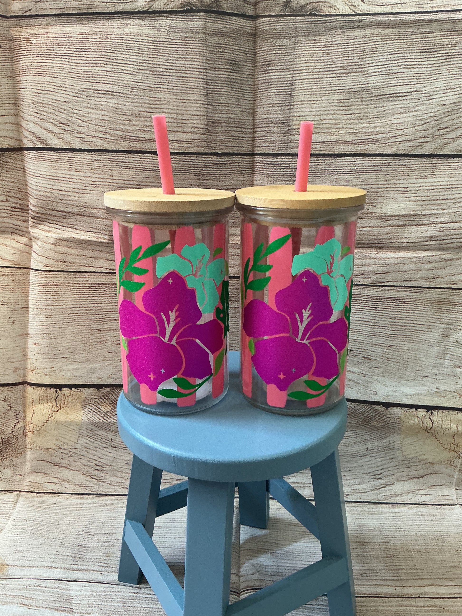 This glass pink striped cup has the sparkliest hibiscus floral decal.