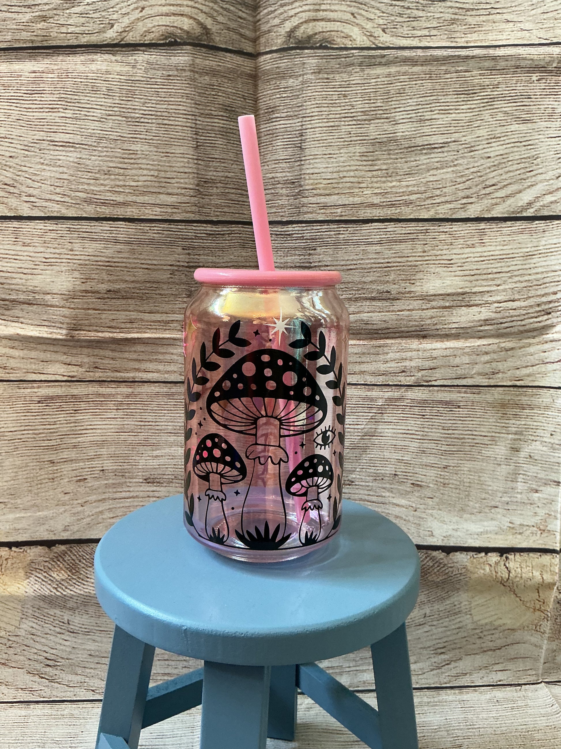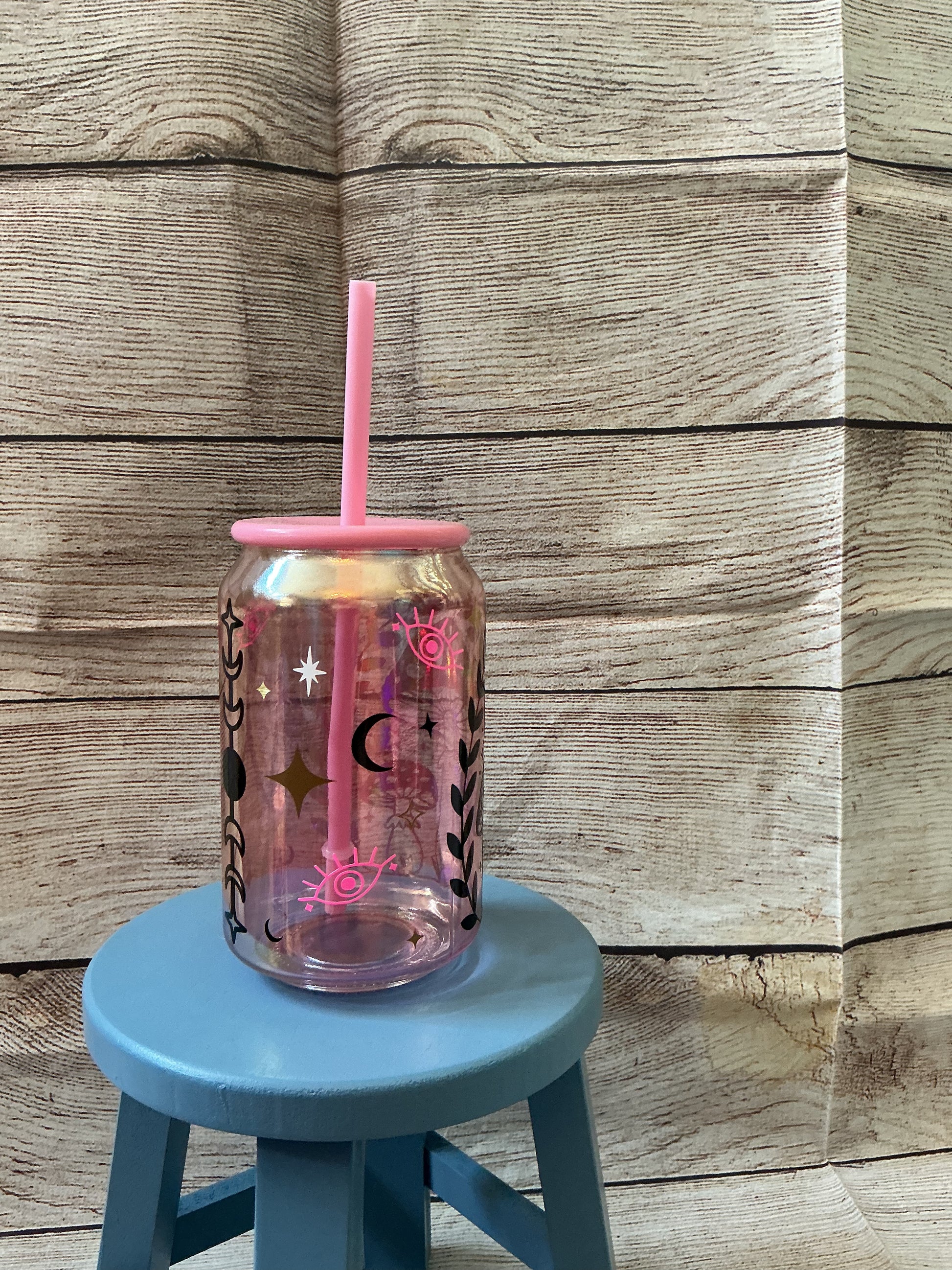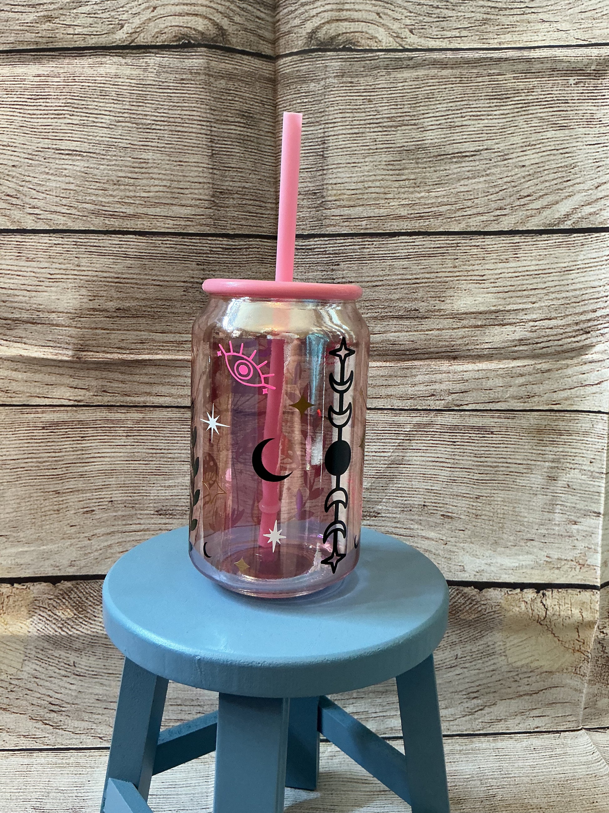 This cute pink glass cup has the cutest mushroom, moon, star and eye decal!