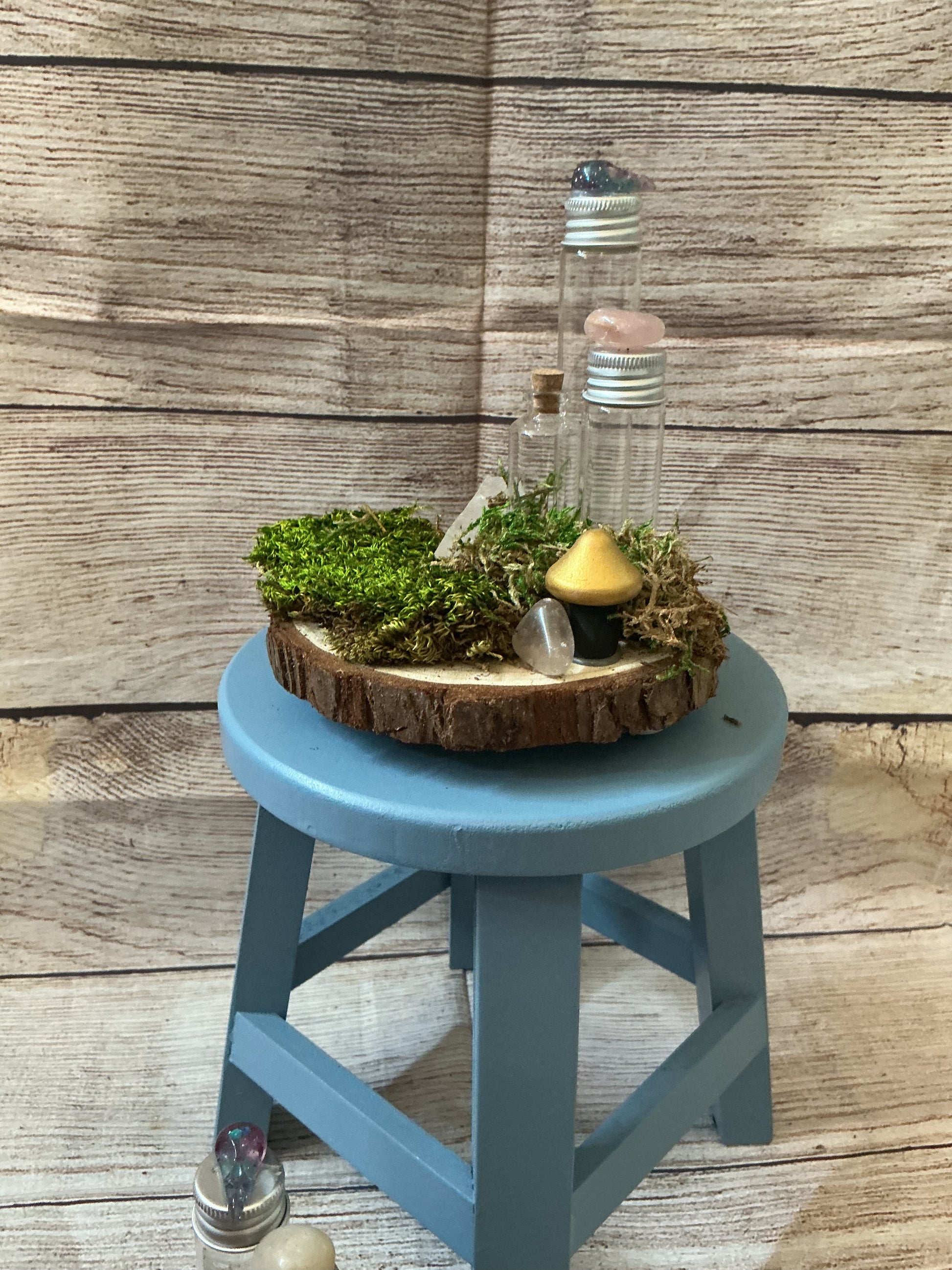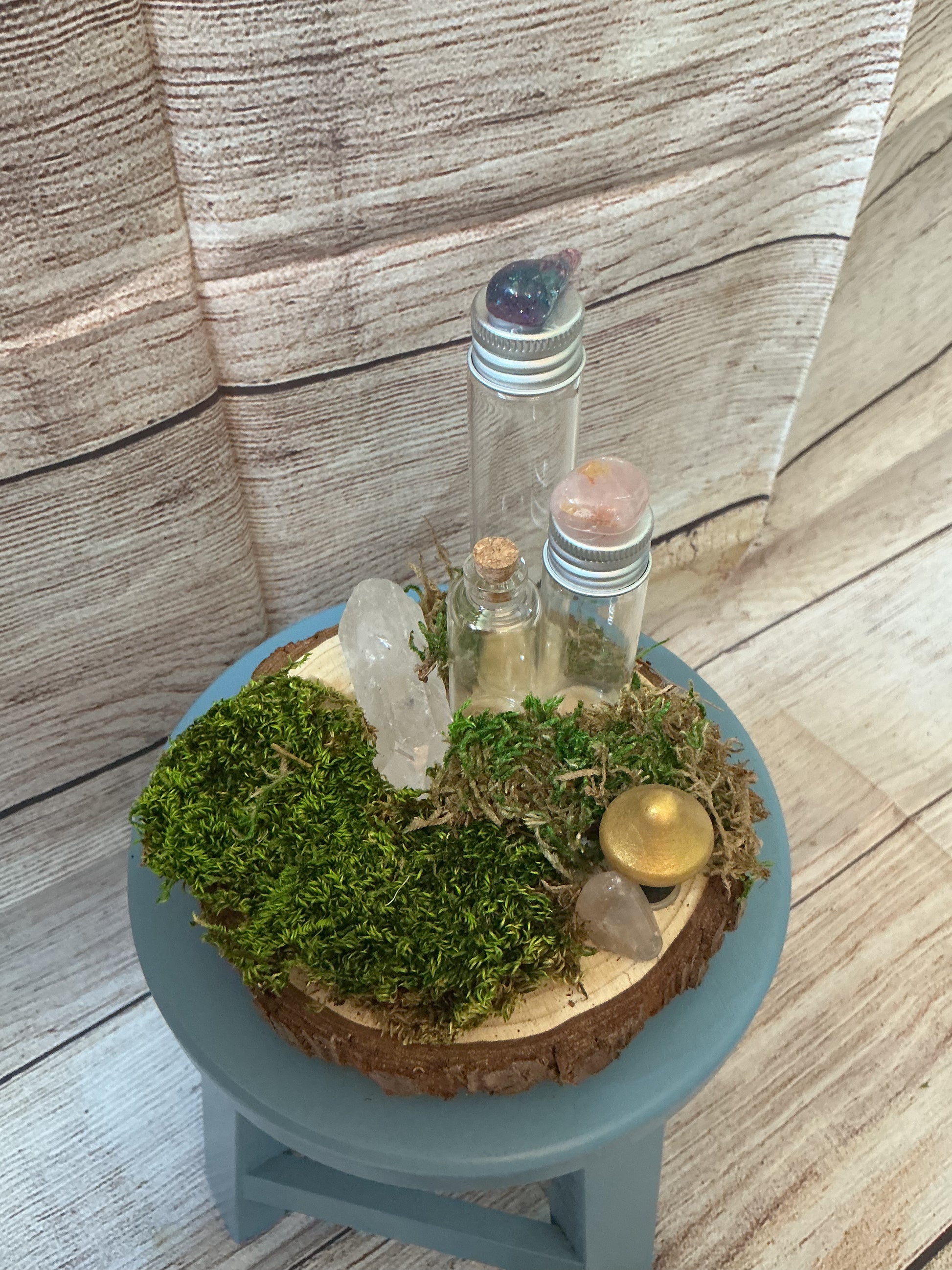 A little wooden platform is about 5.5 inches in diameter and has 3 little glass jars, perfect for propagating your plants! Made with real moss and crystals, this is sure to bring the magic of outdoors inside!